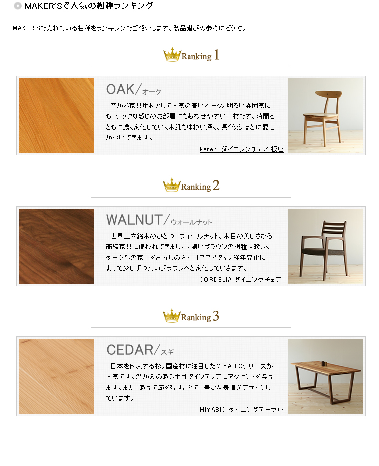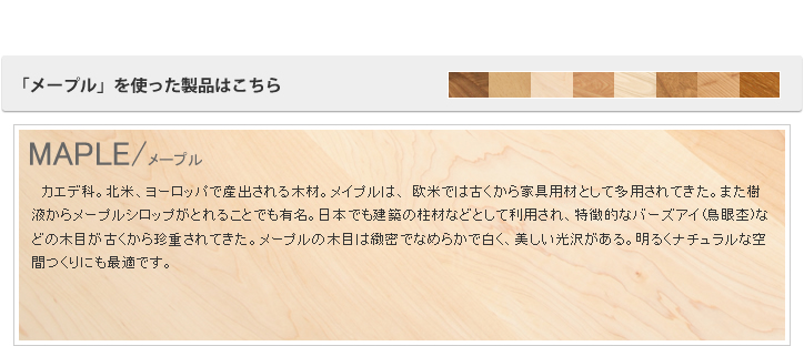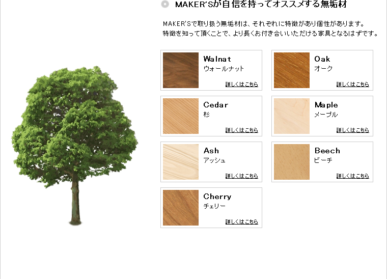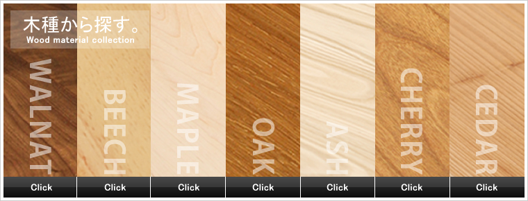 樹種も、ウォルナット・メイプル・オーク・ブラックチェリーなど、豊富に取り揃えております。